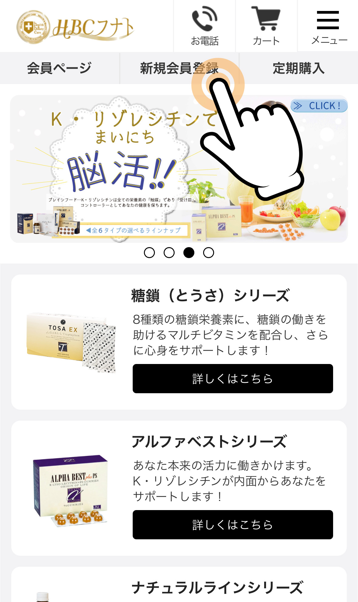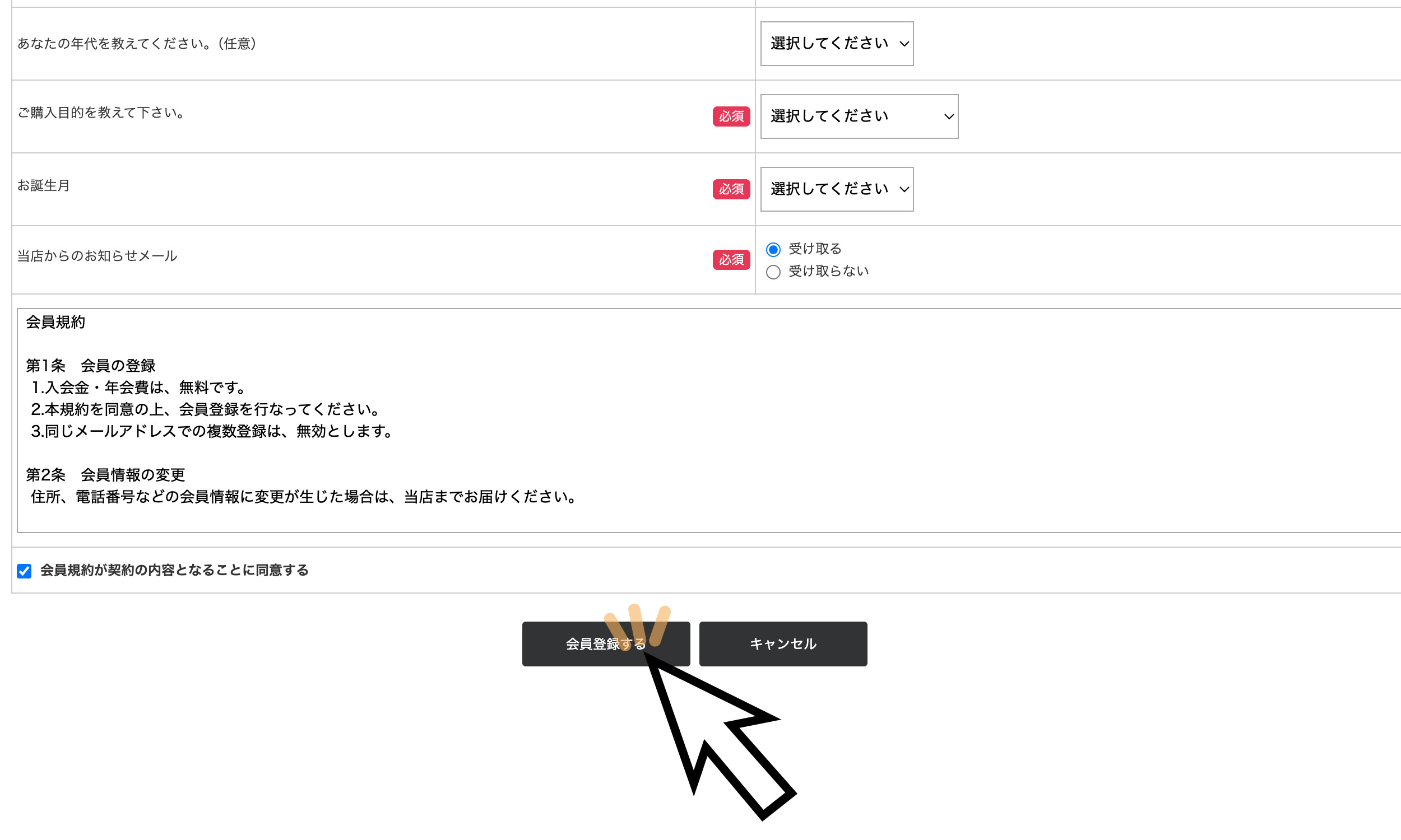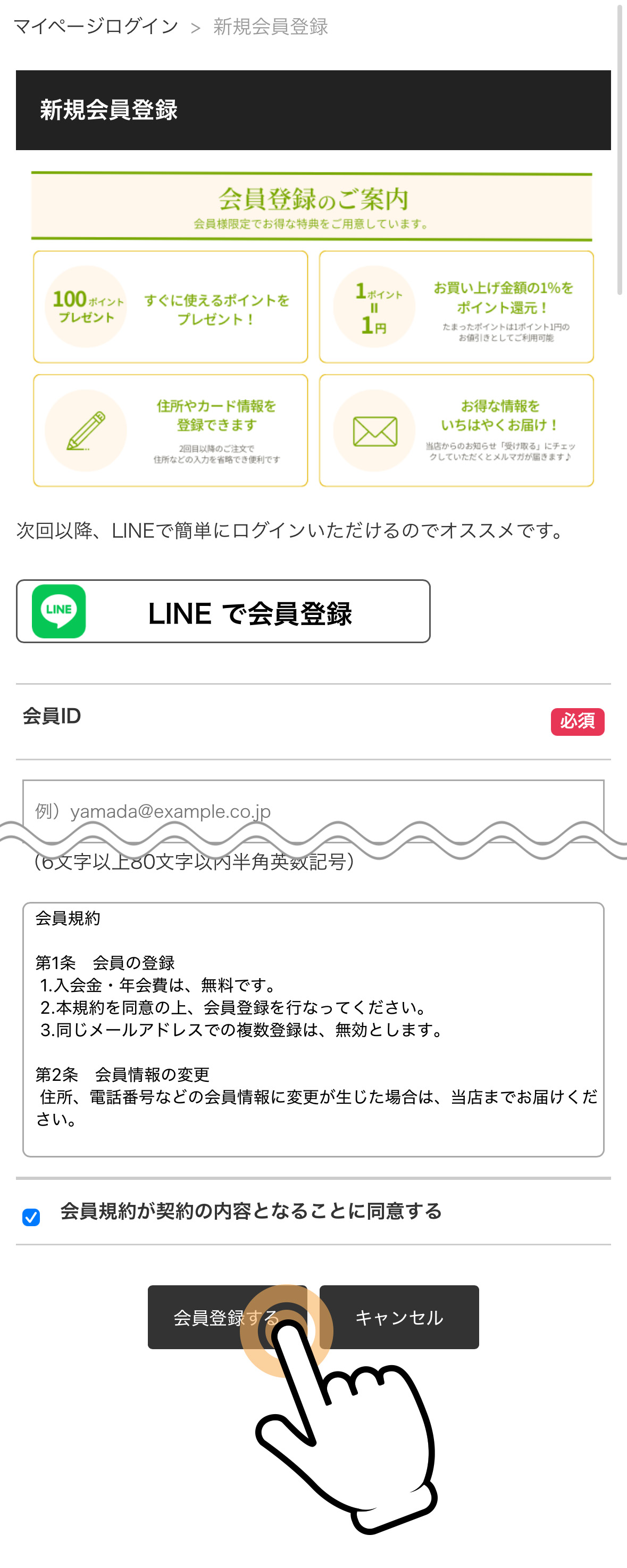 会員登録は、①あらかじめご登録いただく方法と、②はじめてのご注文時に商品のお届け先などと一緒に、ご登録いただく方法があります。