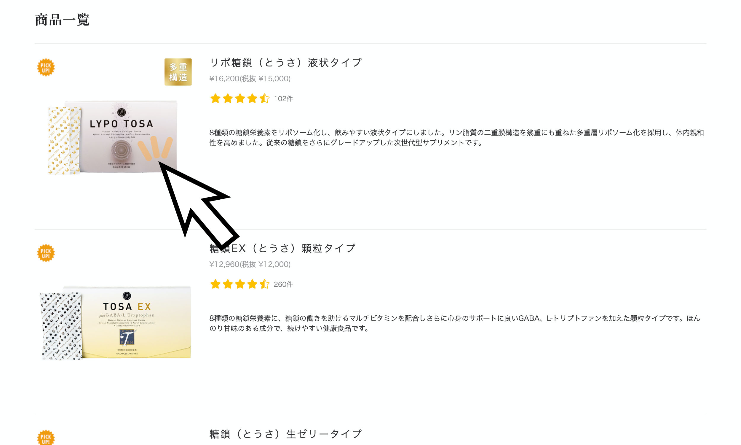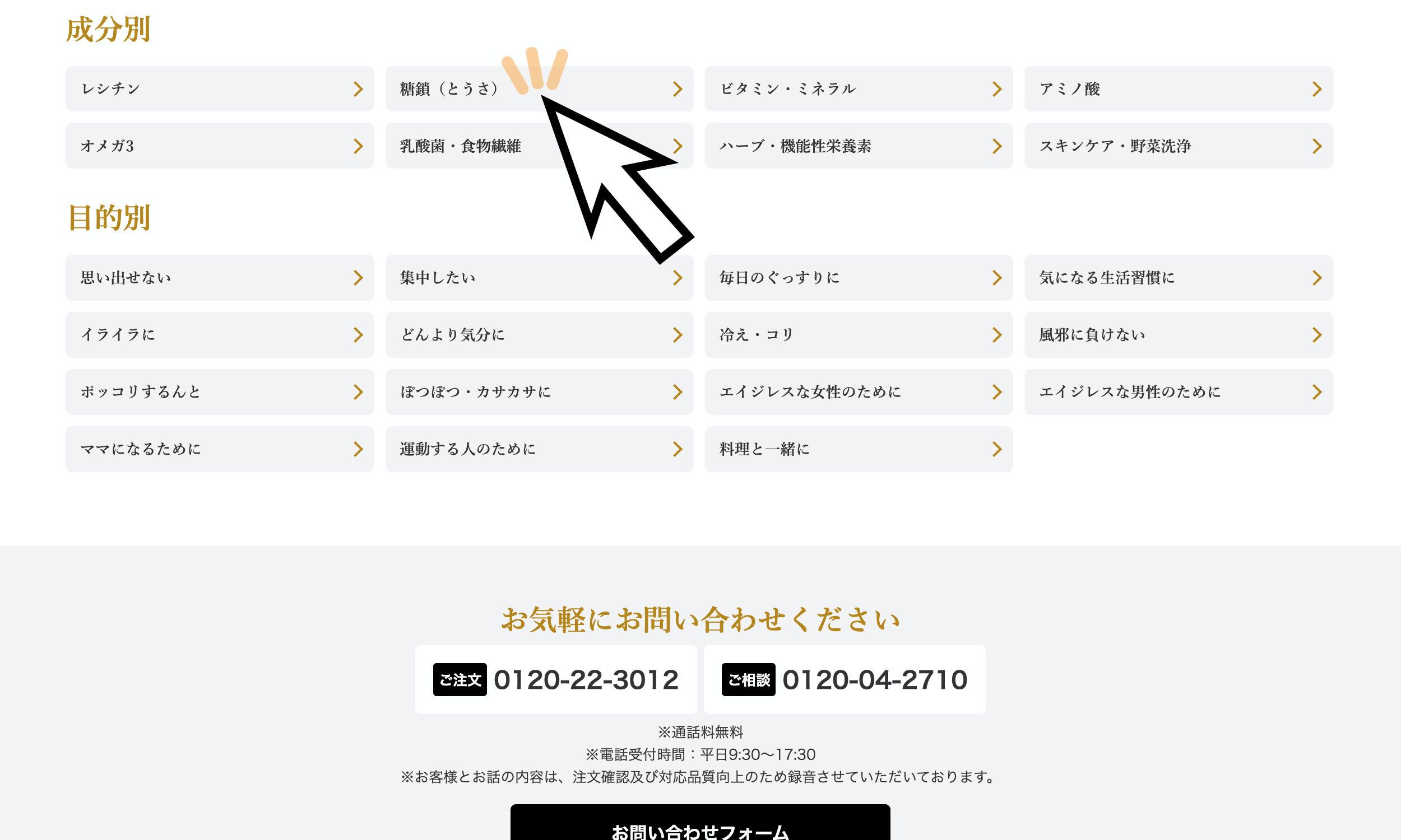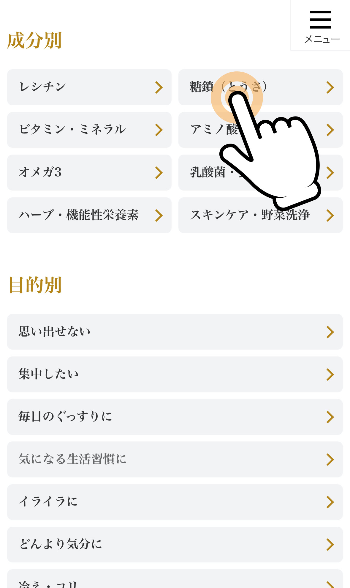 ご希望の商品をトップページのカテゴリ、「成分別」や「目的別」、各種項目からお選びください。