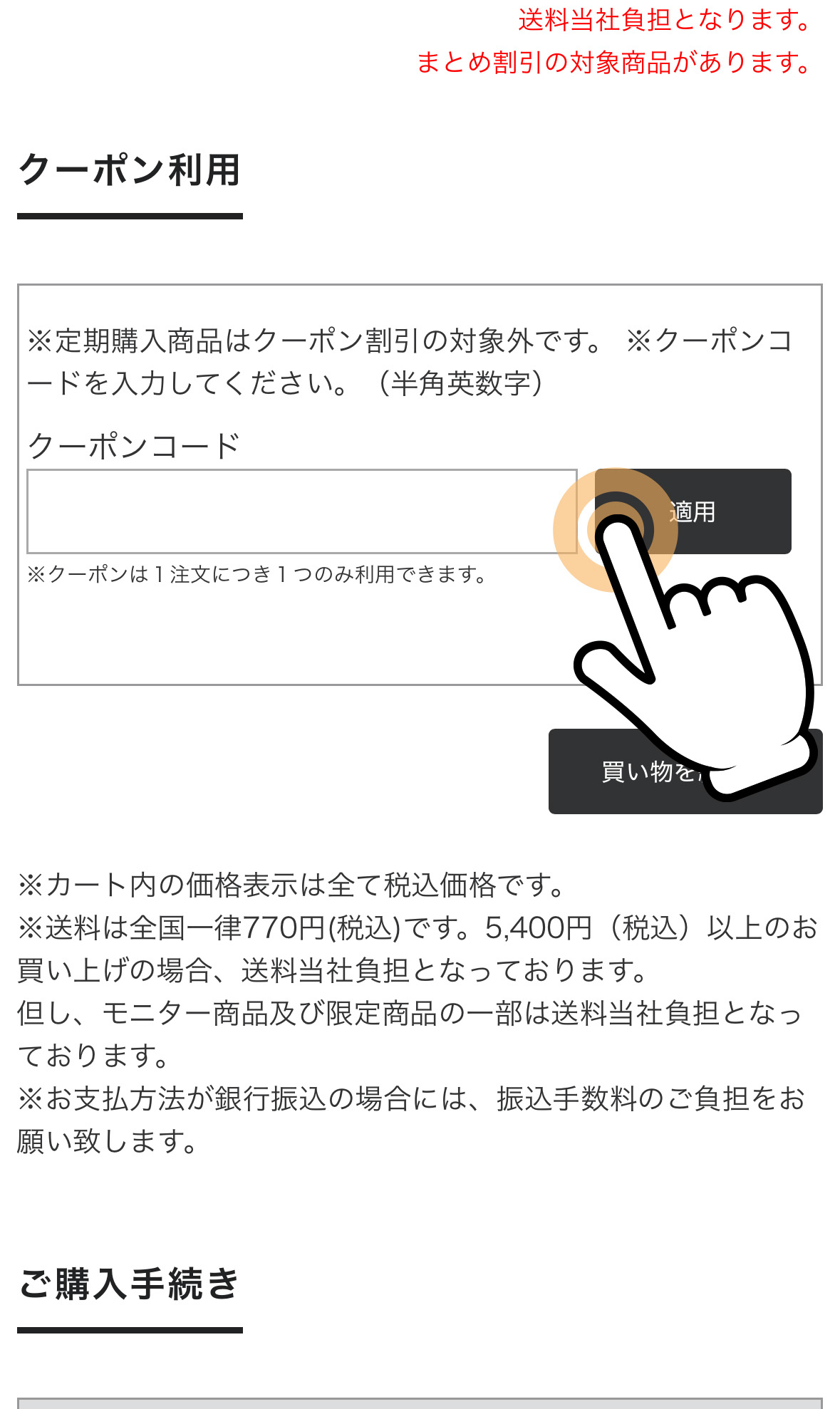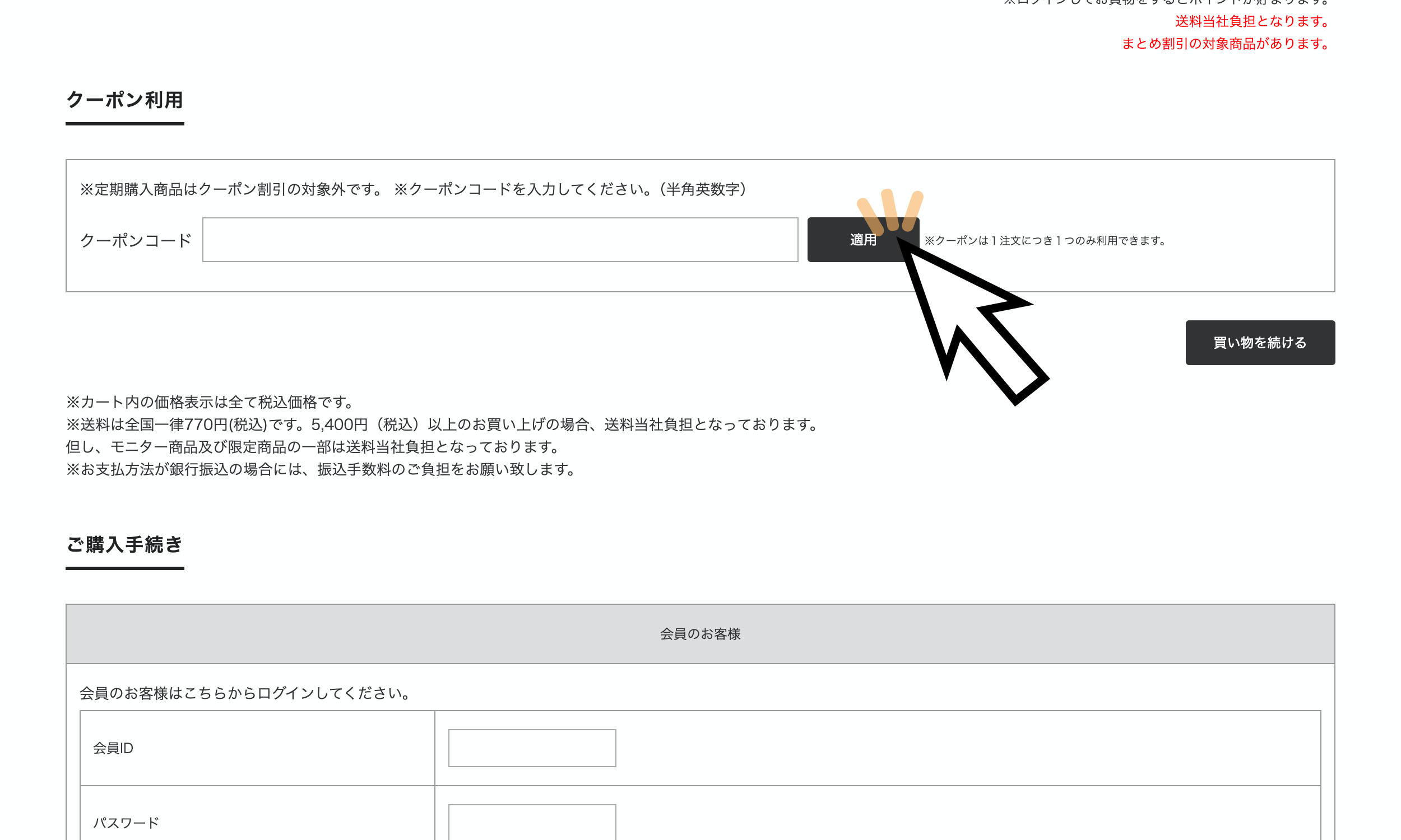 クーポンのご利用をご希望の際は、クーポンコードをご入力の上[適用]をクリックしてください。