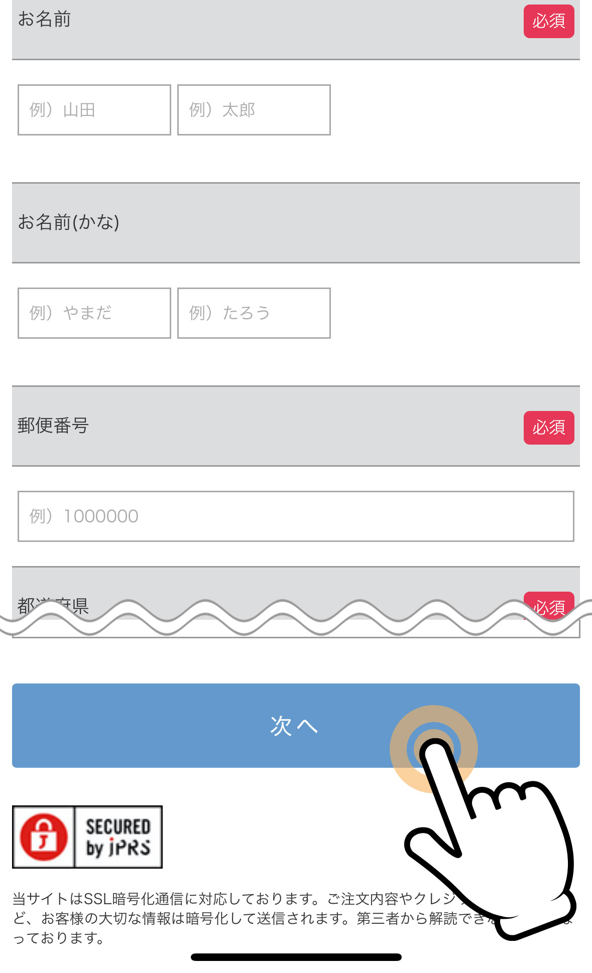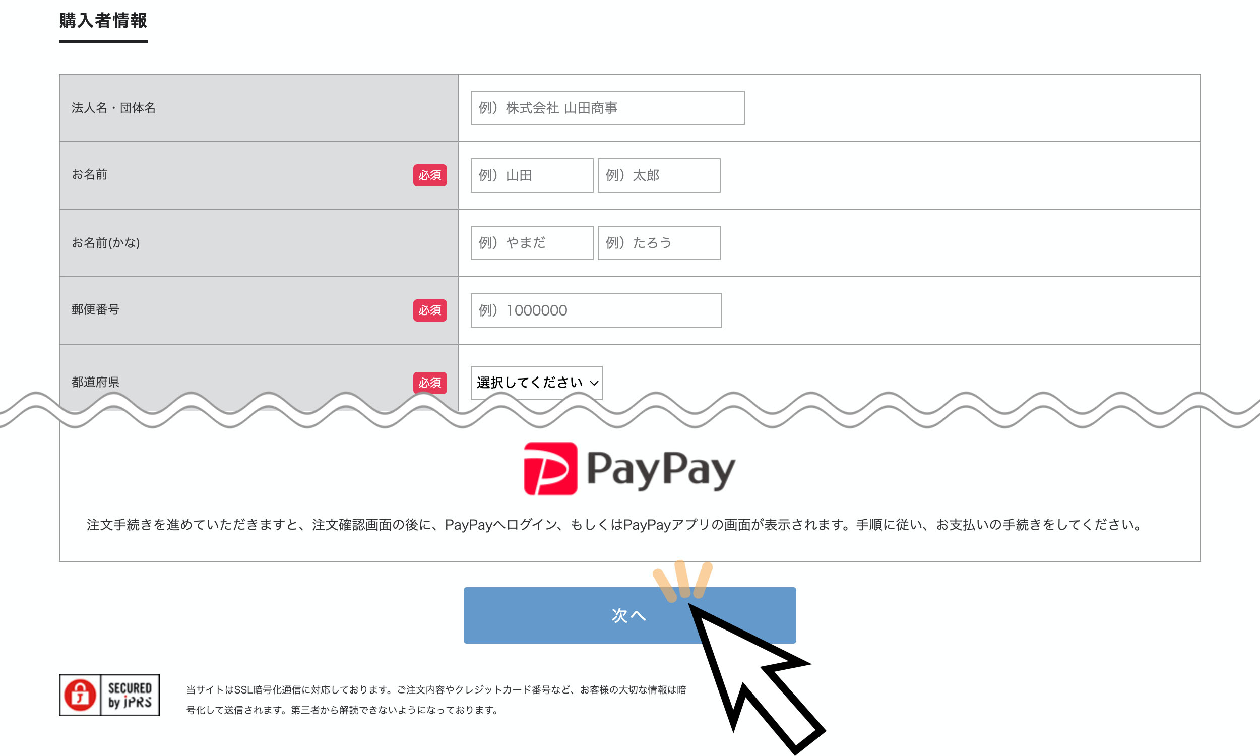 「購入者情報」「お届け先選択」「お支払方法選択」を入力し、次へをクリックしてください。(会員登録・ログイン済みのお客様は、事前にご登録いただいた内容が反映されます。)
