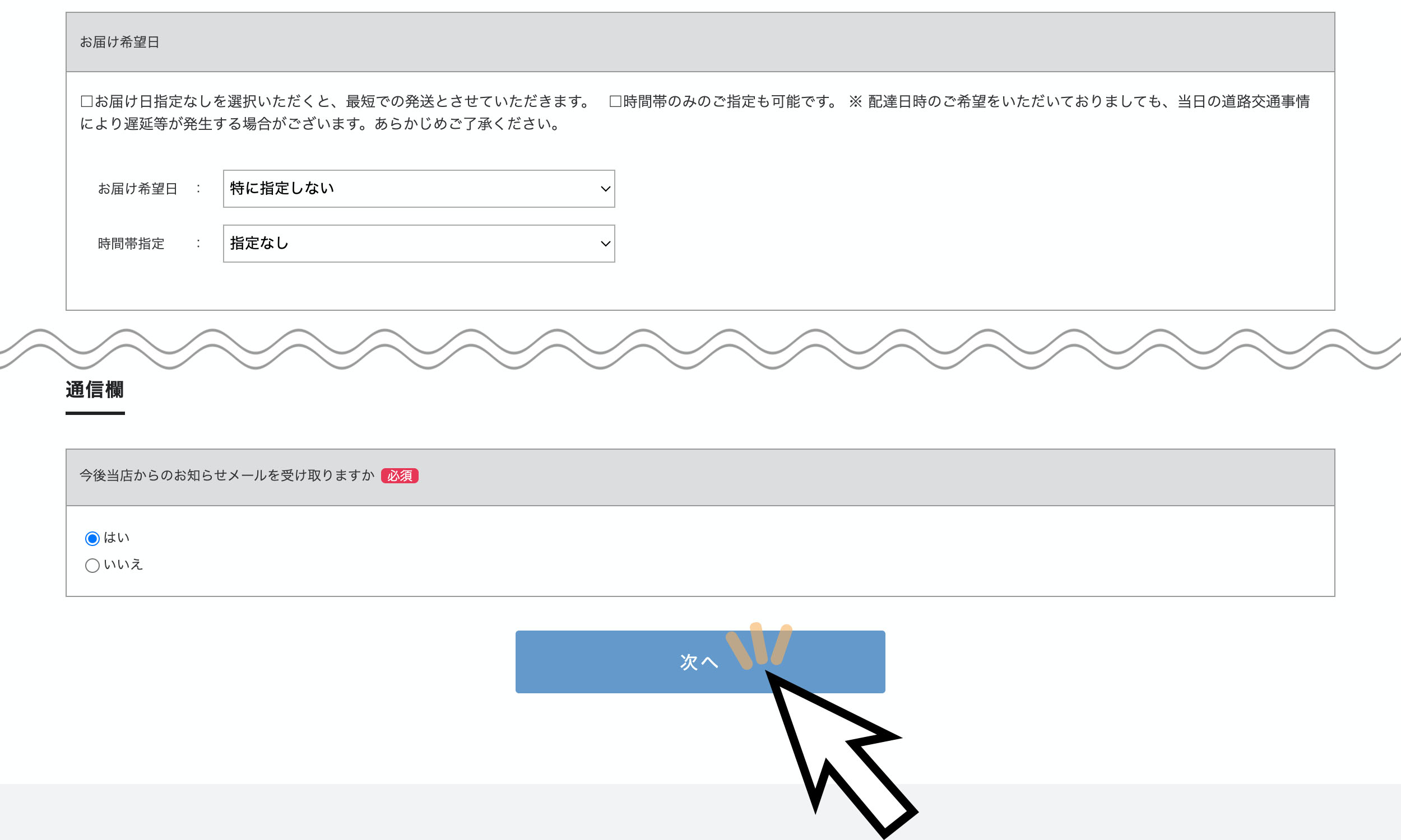 何かご要望がござましたら「お届け希望日」「通信欄」へ記入してください。アンケートにチェックをしていただけましたら[次へ]をクリックしてください。