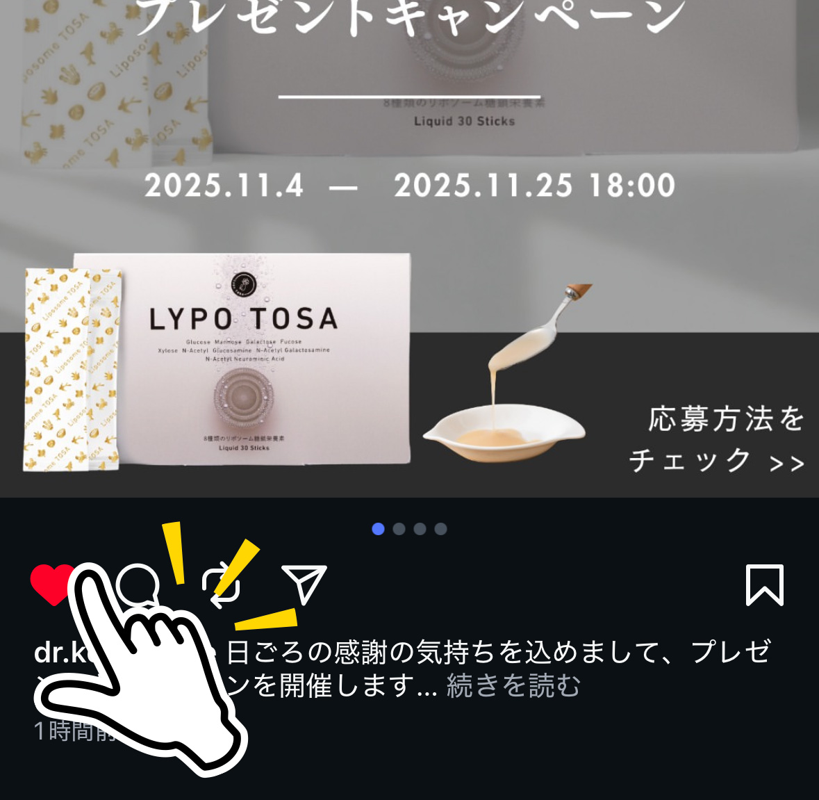 期間中、HBCフナトInstagramアカウント(@DR.KOZU_NOTE)をフォローし、キャンペーン記事に「いいね」を押された方の中から、抽選で1名様にリポ糖鎖(30包入)1箱を、抽選で19名様にリポ糖鎖お試し5包入りをプレゼントいたします。